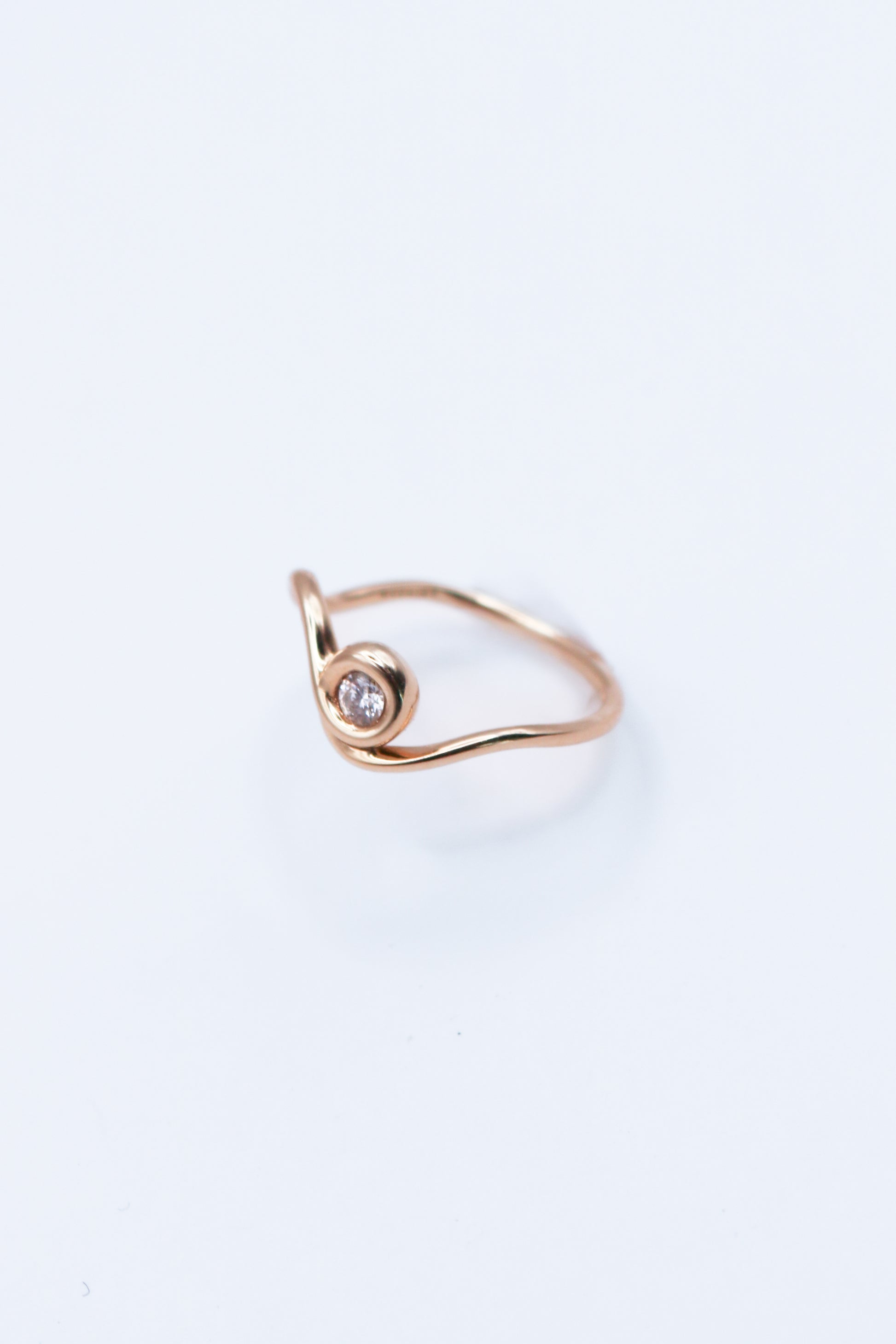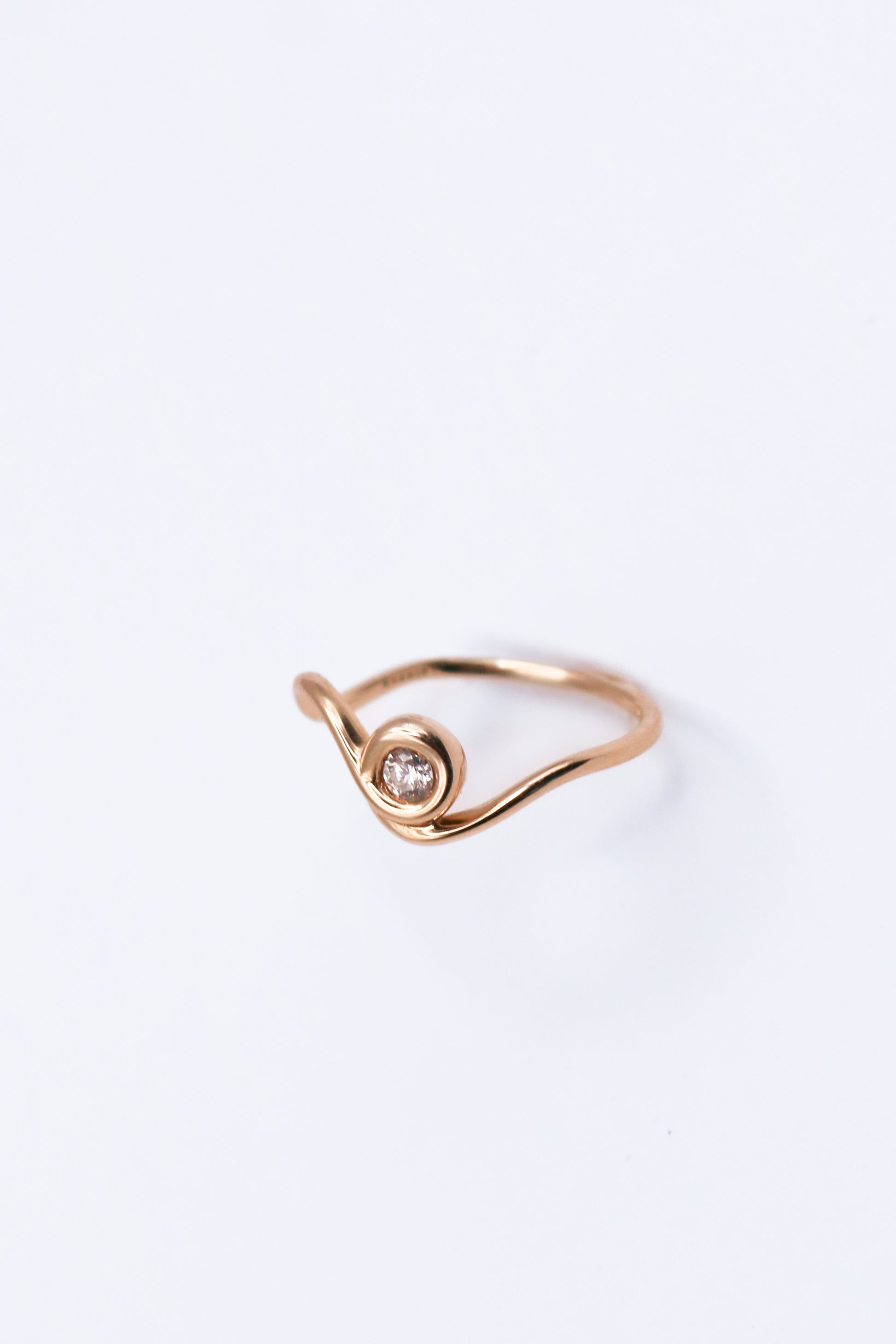 The Aura ring is crafted in 14k gold with a 8pt diamond. This delicate piece captures attention and presence because of its fine and curved design.