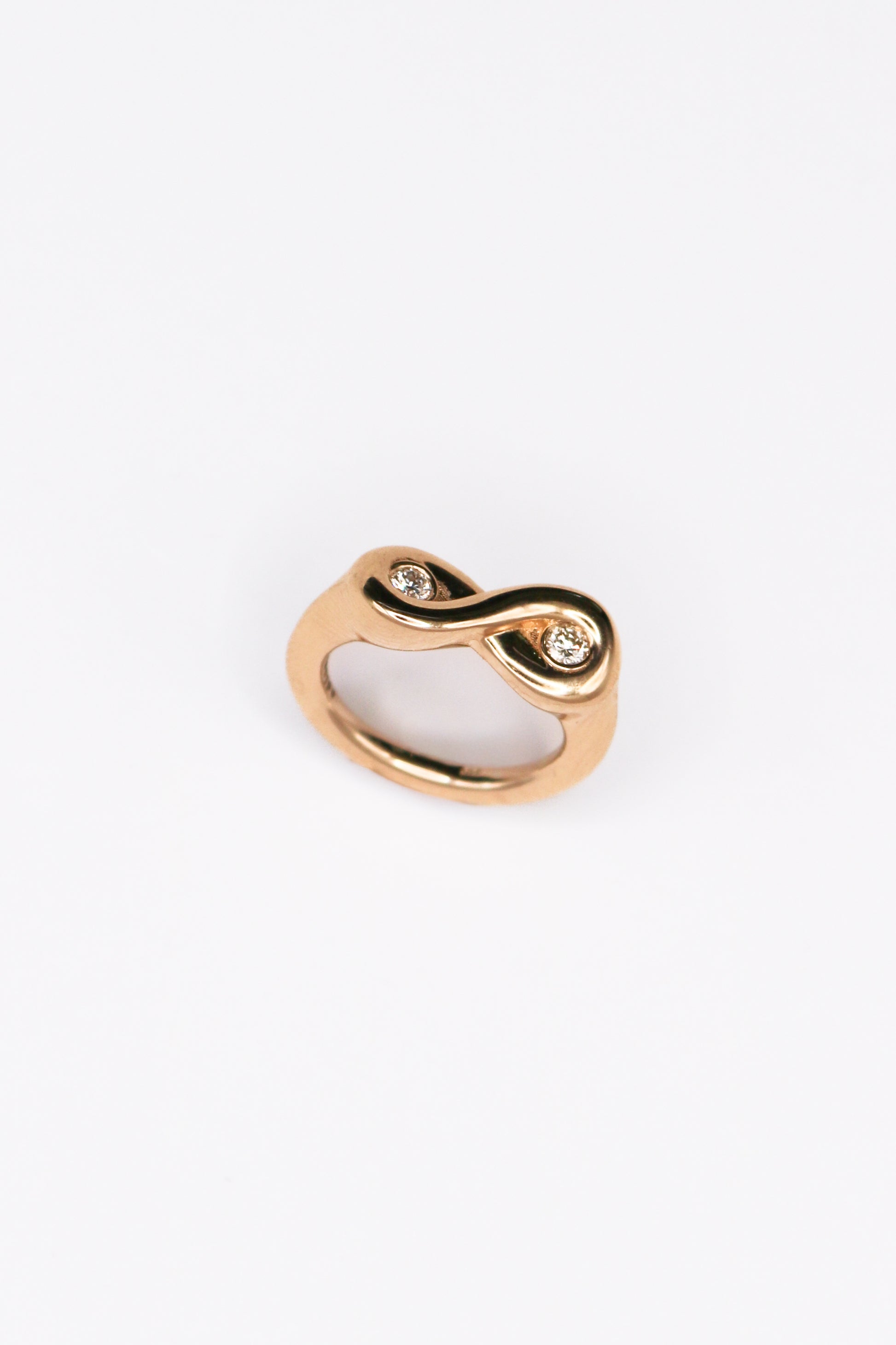 The Axis Ring from our Aether Collection is sculpted in 14k gold and set with sixteen points of diamonds. Inspired in natures infinity and the curves of organic shapes, this ring is the significance of balance, with two diamonds set on the curves bed, it is a beautiful piece.