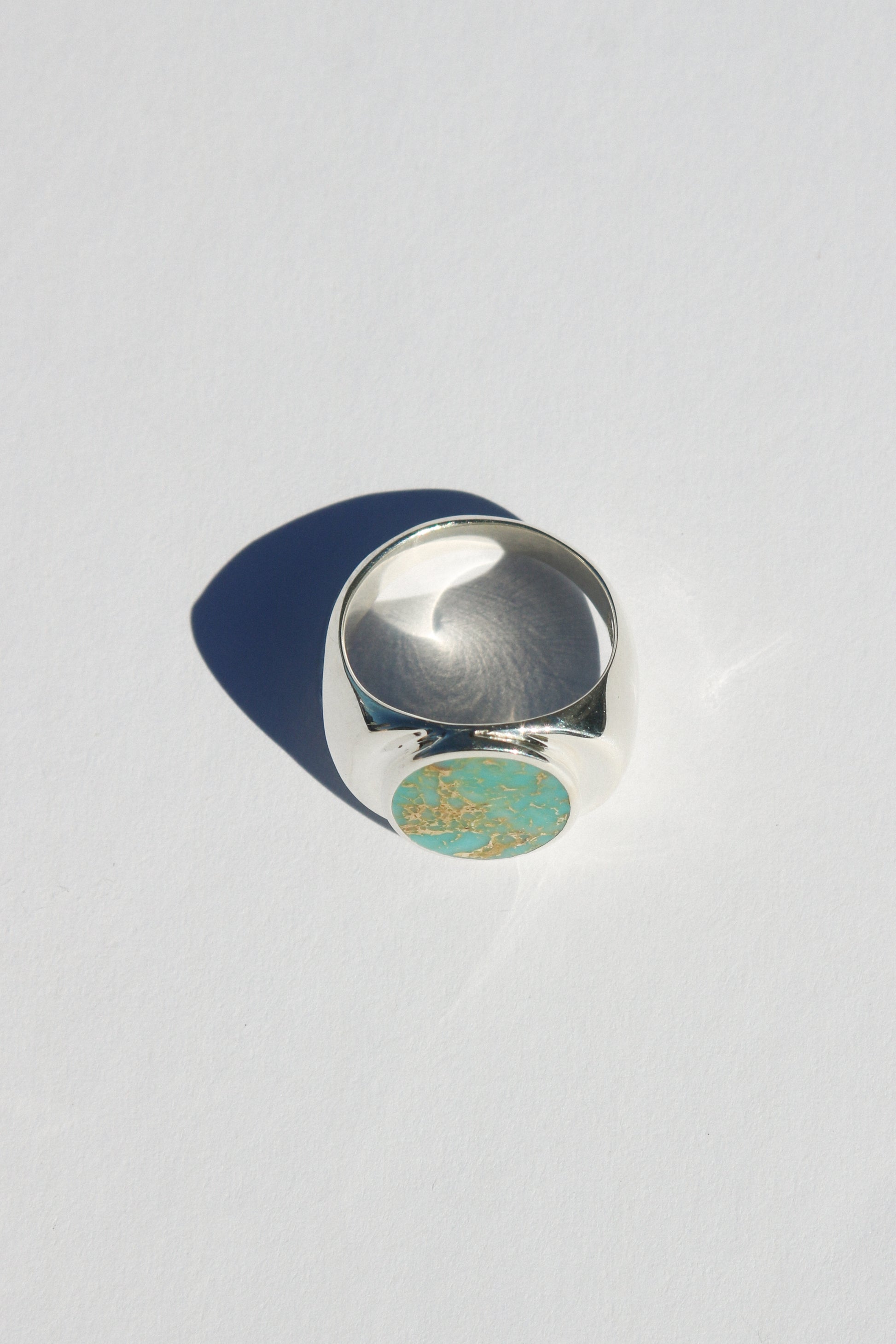 The Perlmutte Turquoise silver ring features a striking stone that embodies clarity and truth. Flecked with sparkly yellow tones, the stone shimmers with an unconventional elegance, a reminder that authenticity is the boldest form of beauty.