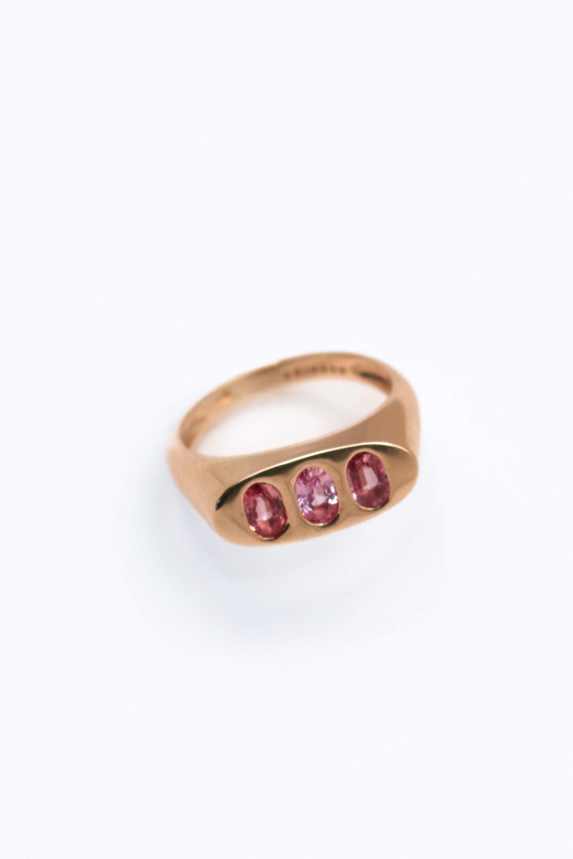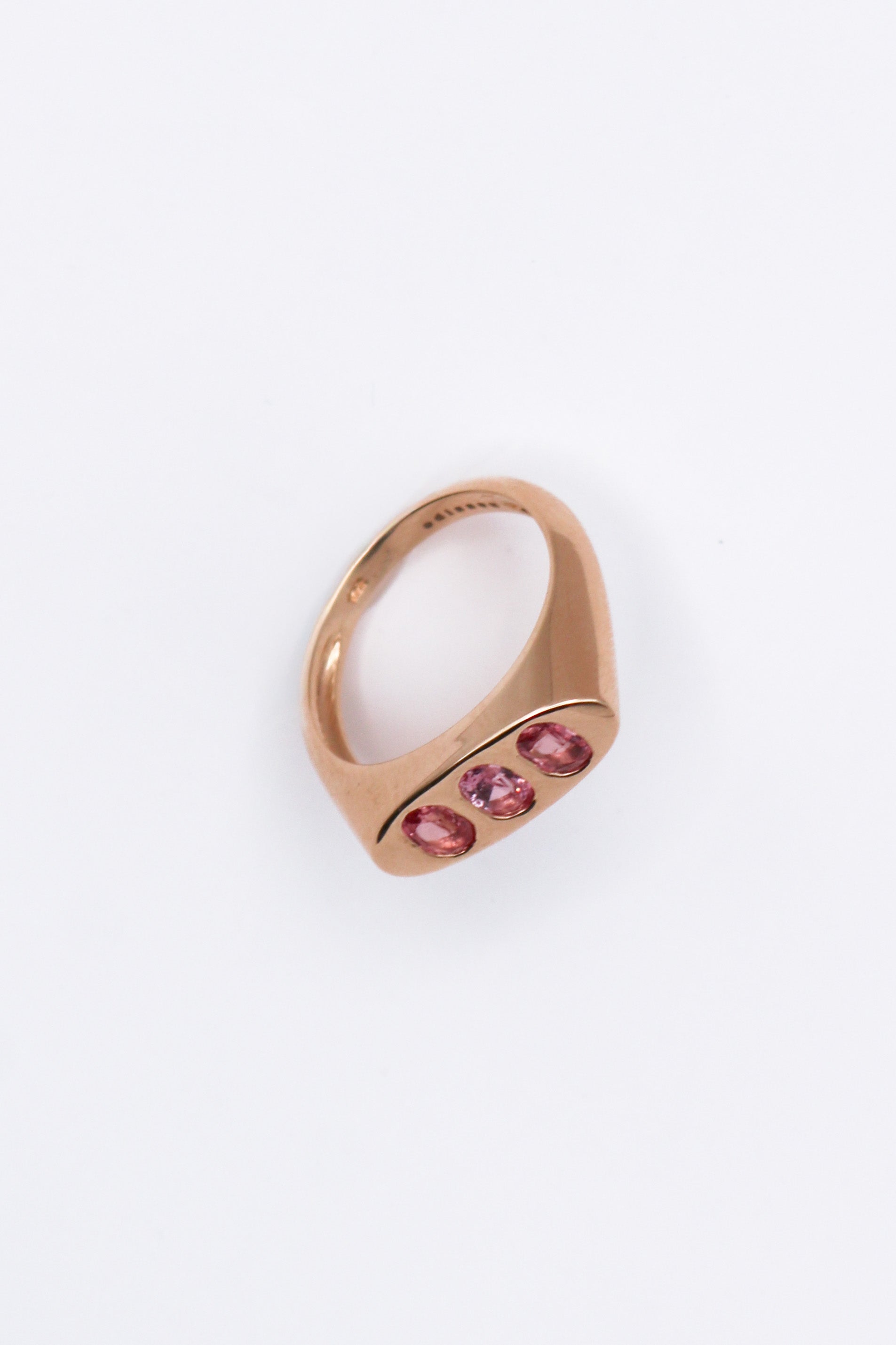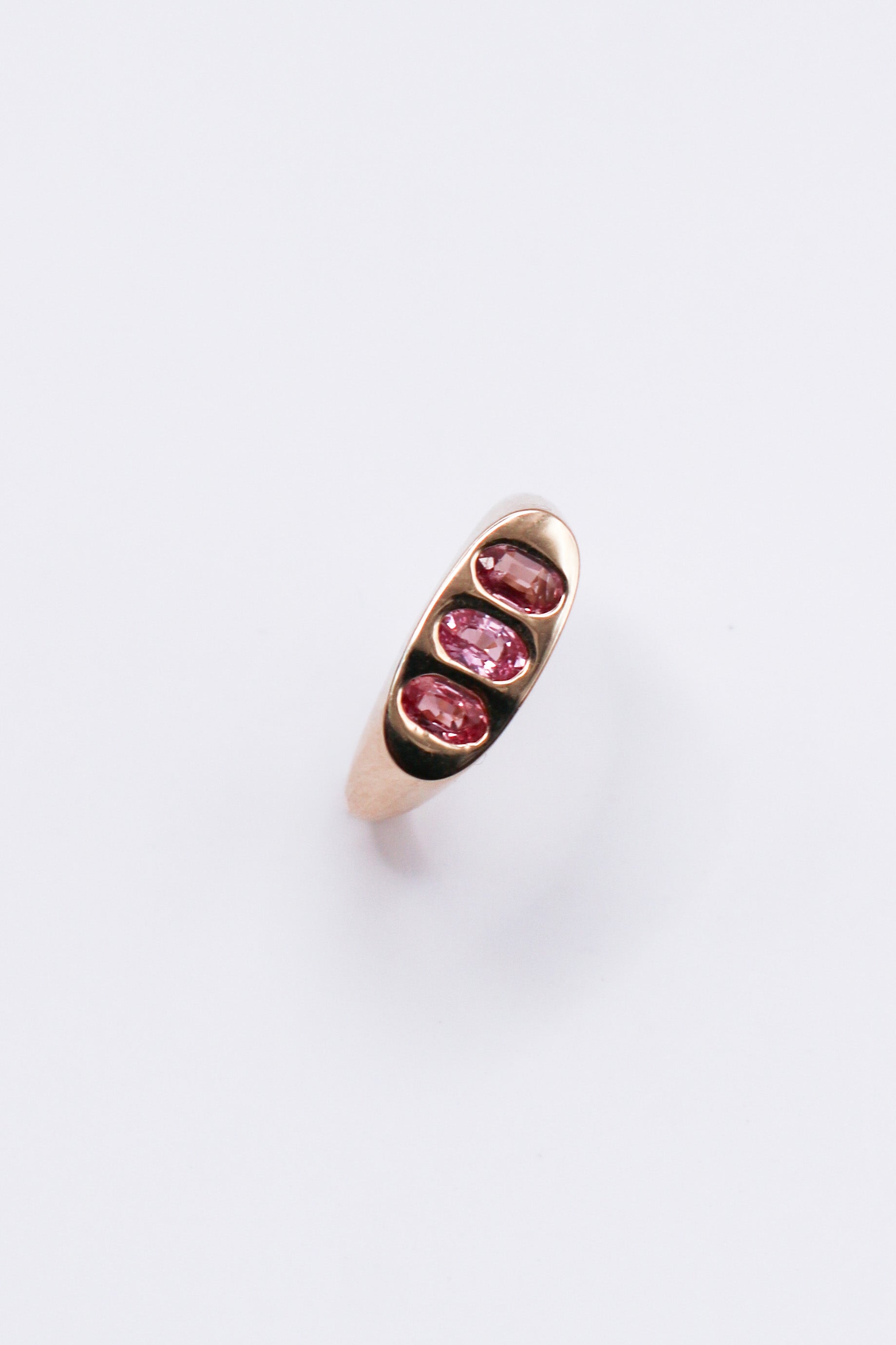 The Táxis ring is crafted in Gold representing order, arrangement and alignment with it's three tourmalines set, each in a different pink hue.