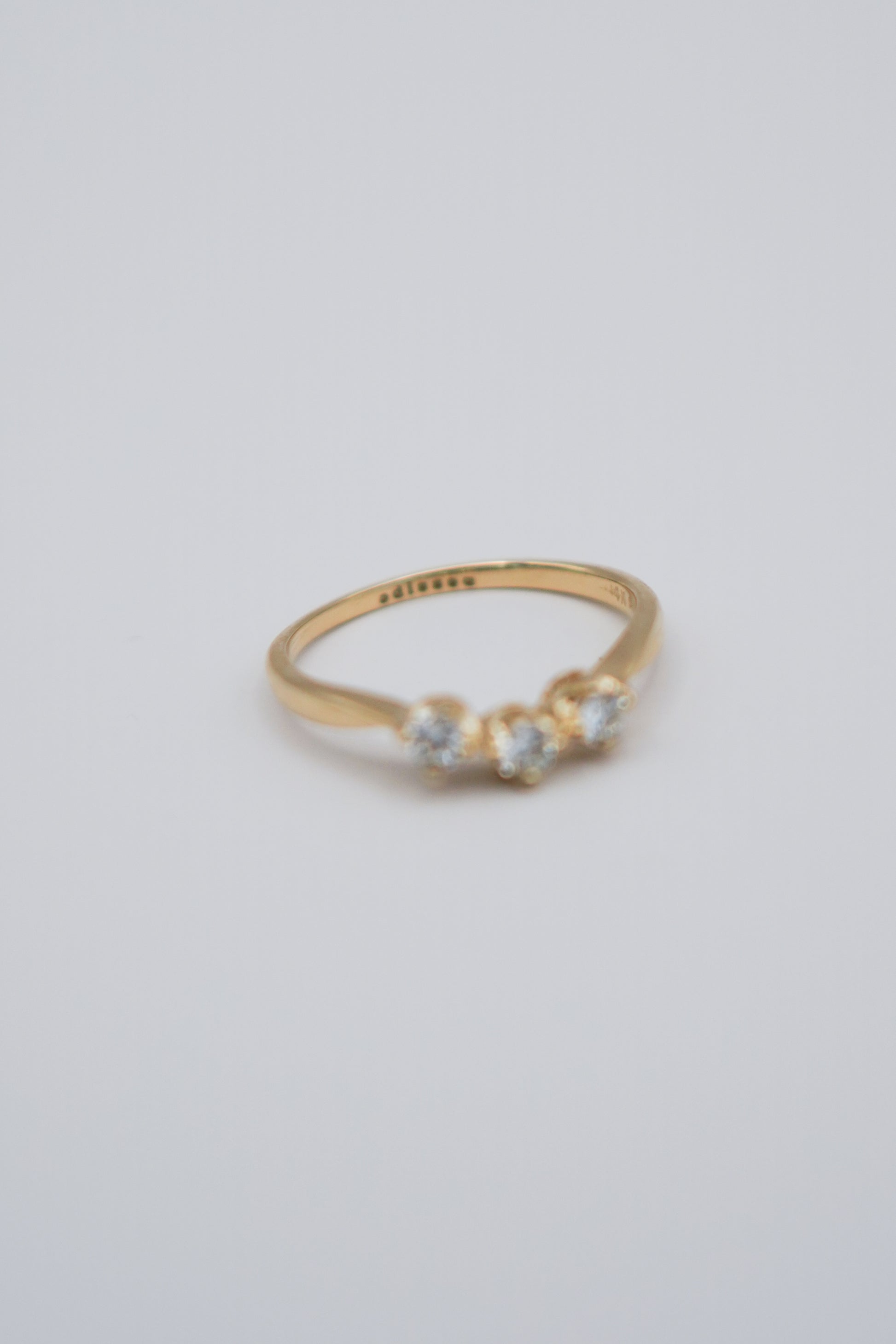 The Triad Ring is sculpted in 14k gold and set with 28 points of diamonds. Its three-stone constellation is symbolic past, present, and future. It honors the elegance of simplicity in a very minimal design.